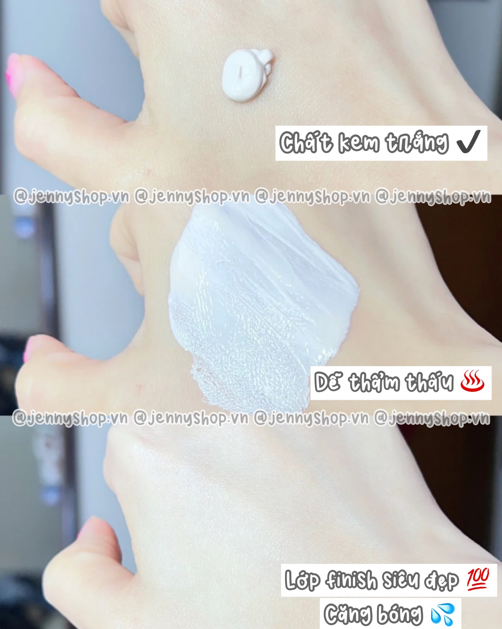 👉 Chất kem ít bóng nhất - gần như là không bóng. Nhưng em nó lại làm bề mặt da nhìn mọng hơn, cảm giác da có nước hơn chứ không khô mốc