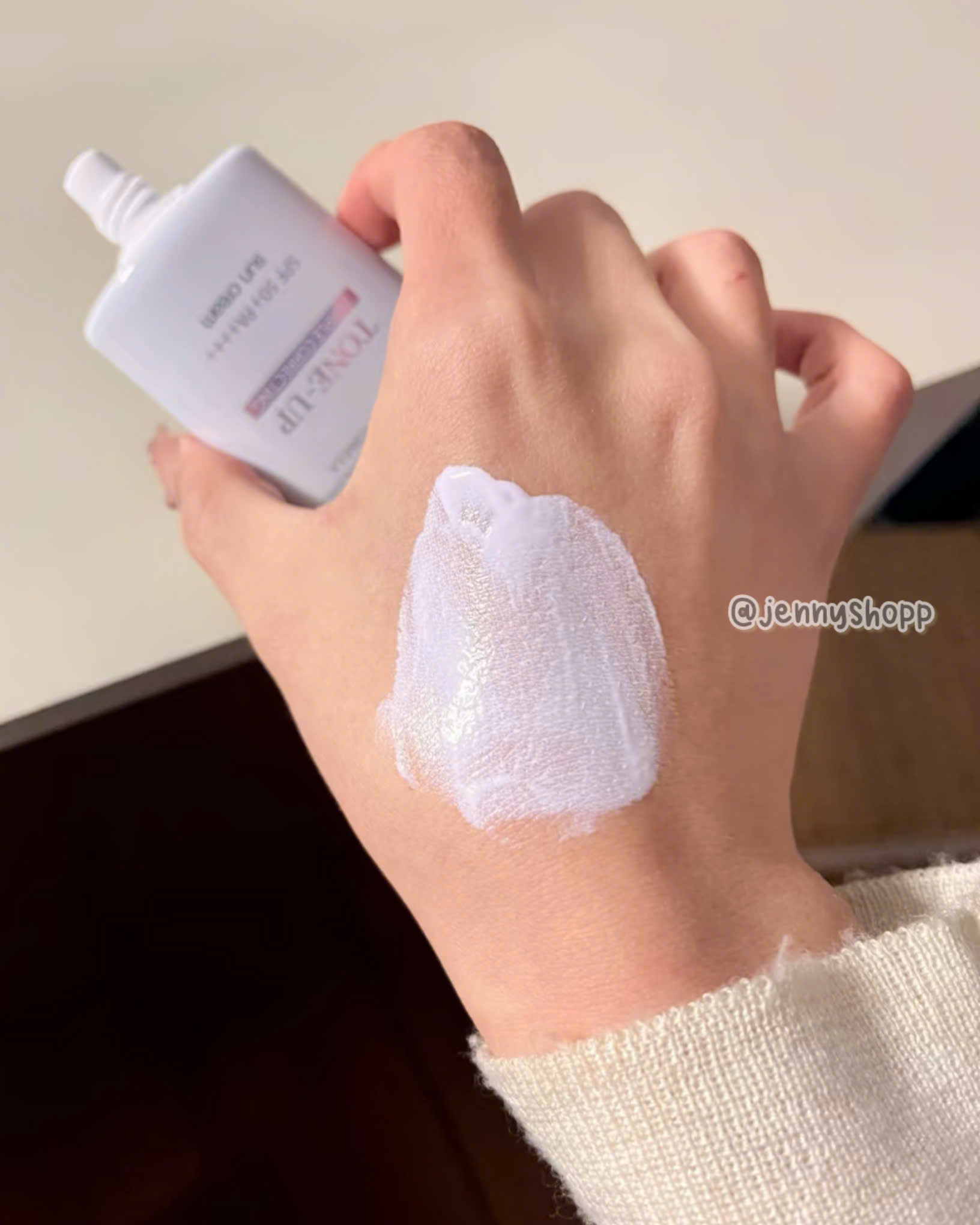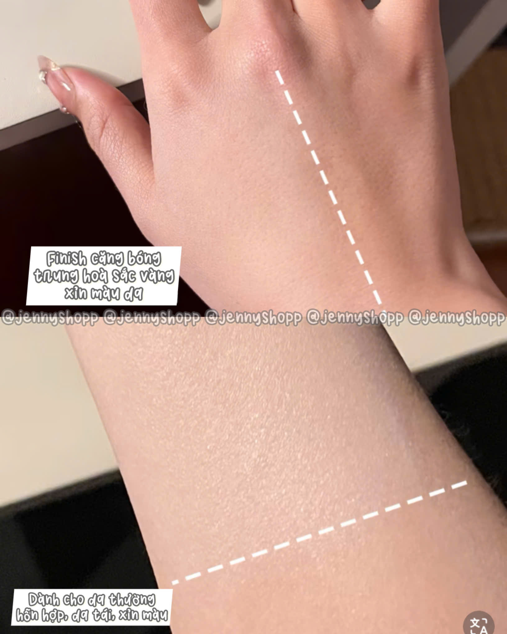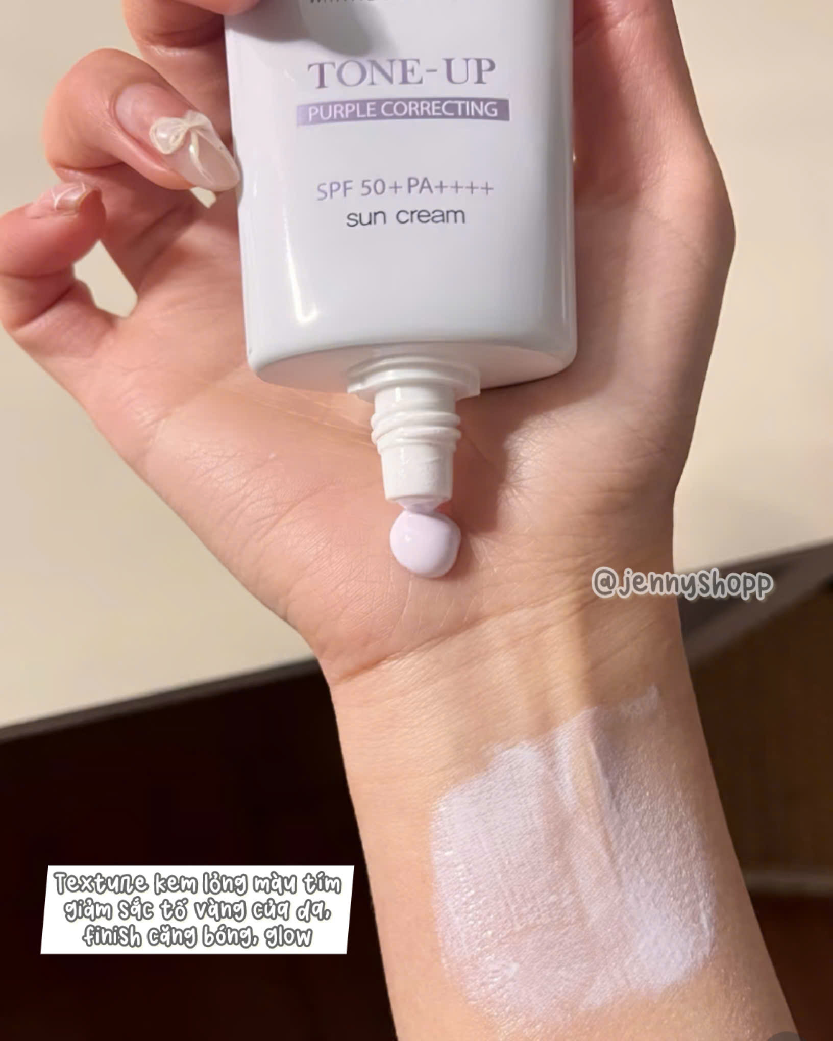 Texture dạng kem lỏng, màu tím, dễ tán, thấm nhanh, nâng tone tự nhiên, làm giảm sắc tố vàng trên da và tạo finish căng bóng, glow.