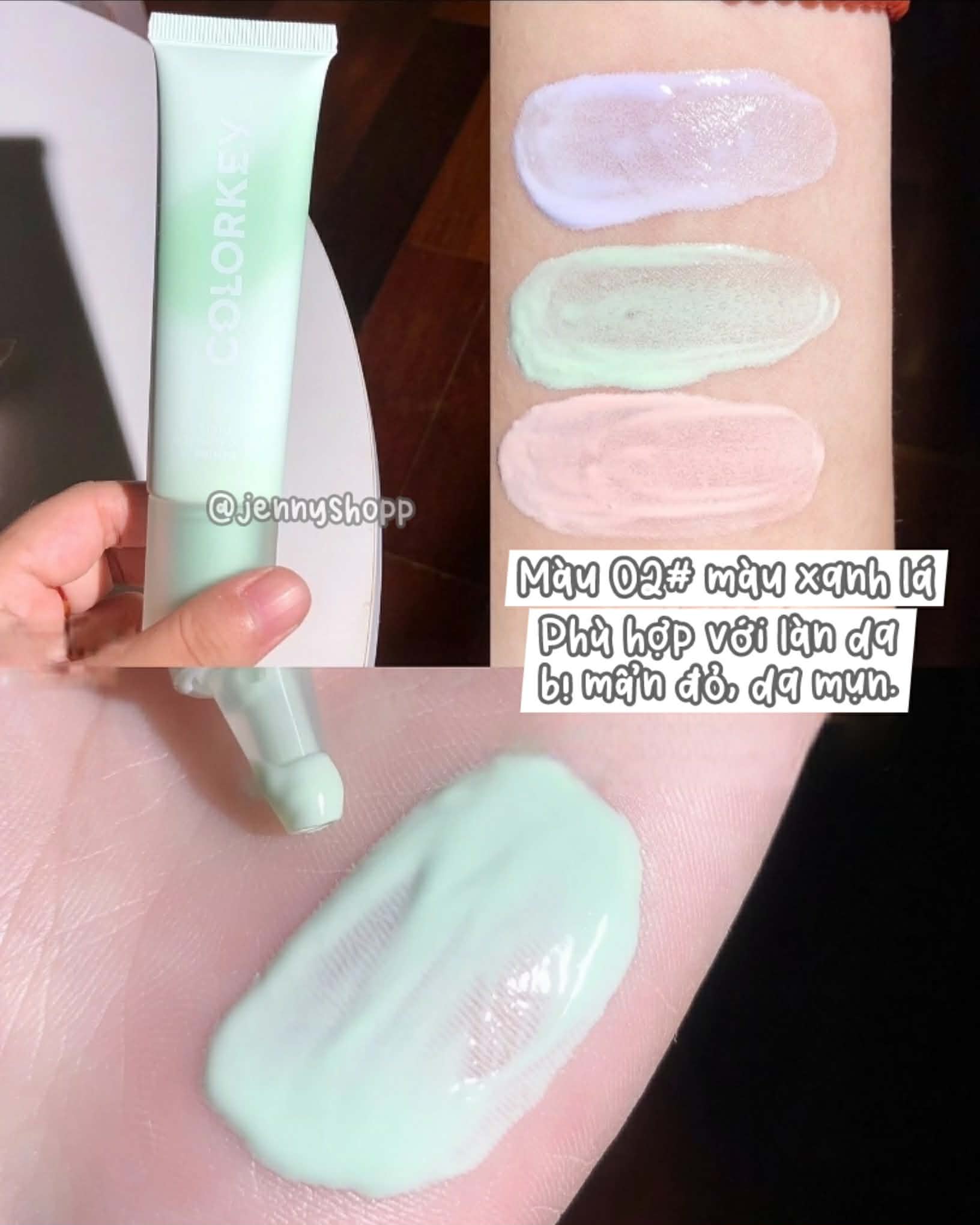 💚 Màu 02 - Xanh Tươi Mát: “Khắc tinh” của nốt mụn đỏ và vùng da mẩn đỏ (cánh mũi). Che phủ khuyết điểm cực khéo cho da mụn.
