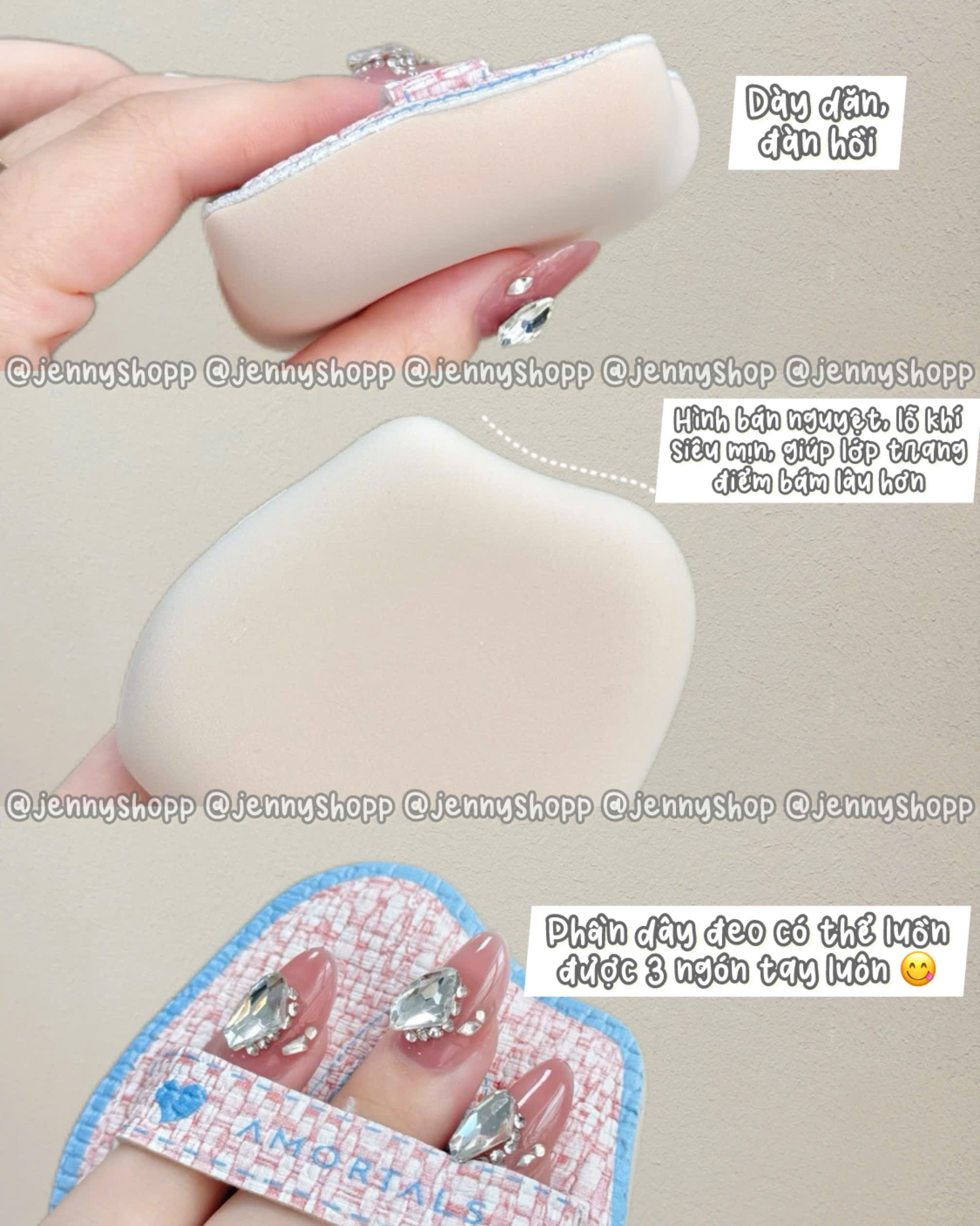 🧚 Bông mút đi kèm có chất liệu vừa mềm vừa dày dặn, độ đàn hồi tốt, dùng để dặm kem nền tệp da, không để lại vệt hay mốc nền, đồng thời hạn chế tối đa tình trạng hút nền.