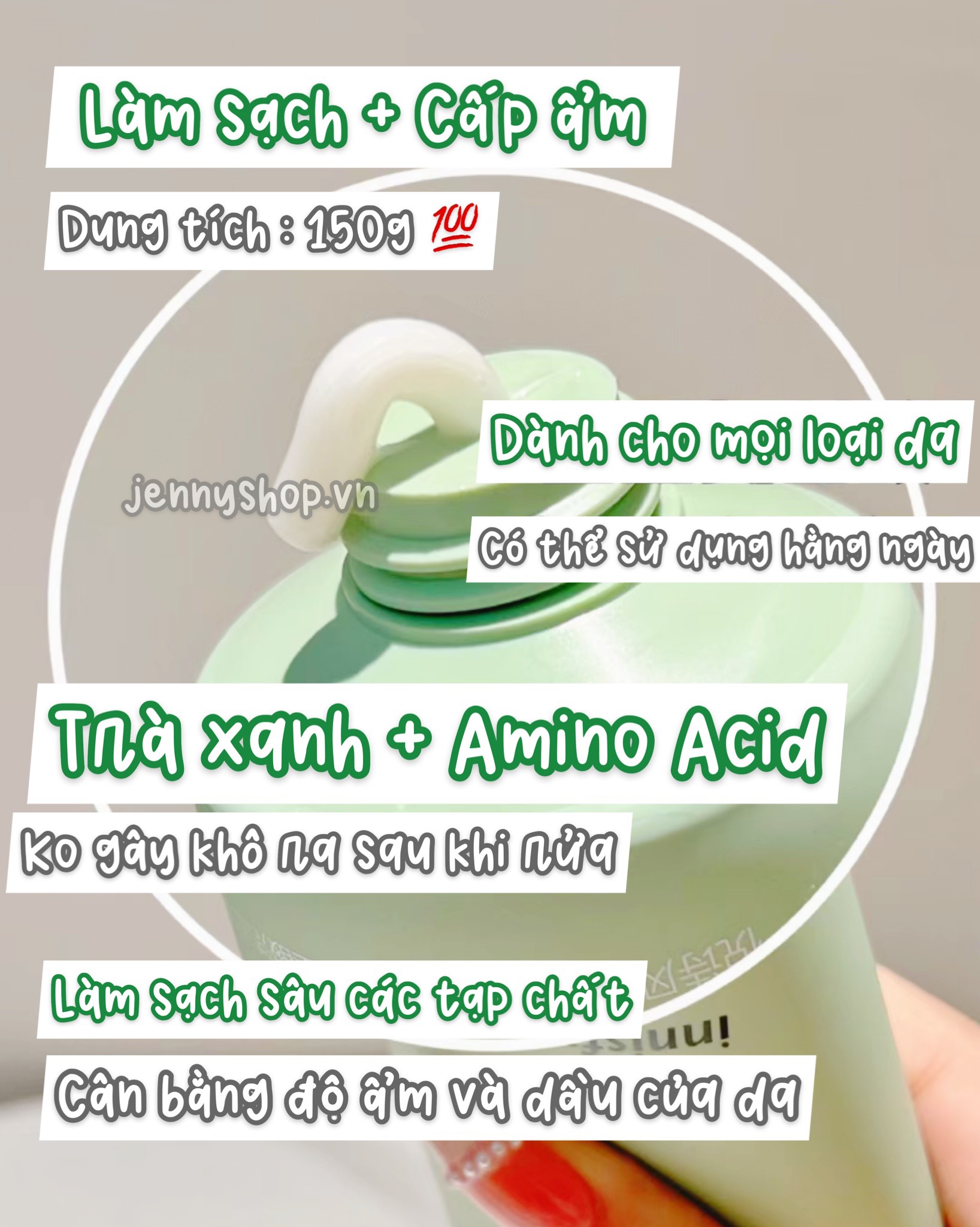 Sữa rửa mặt trà xanh thích hợp cho da bị kích ứng với ô nhiễm môi trường, da có mụn nhưng không quá khẩn cấp giúp làm sạch sâu, tái tạo mới làn da, làm sáng da, chống oxy hóa và ngăn ngừa mụn, viêm hiệu quả.