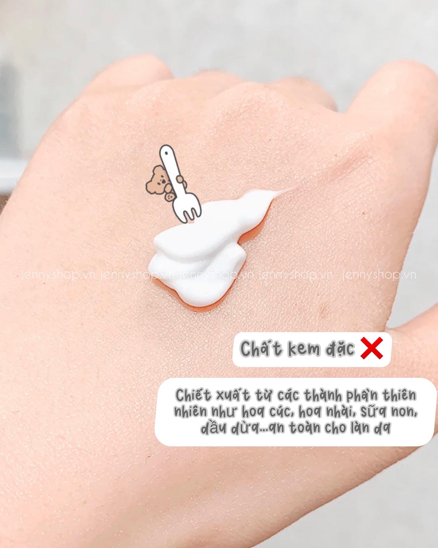 Được chiết xuất từ các thành phần tự nhiên như hoa cúc, hoa nhài, sữa non, dầu dừa…an toàn cho làn da, kể cả những người có làn da siêu nhạy cảm ==> phù hợp với những nàng sở hữu làn da ngăm đen bẩm sinh, da bị cháy nắng hay đang có dấu hiệu lão hóa tuổi tác…