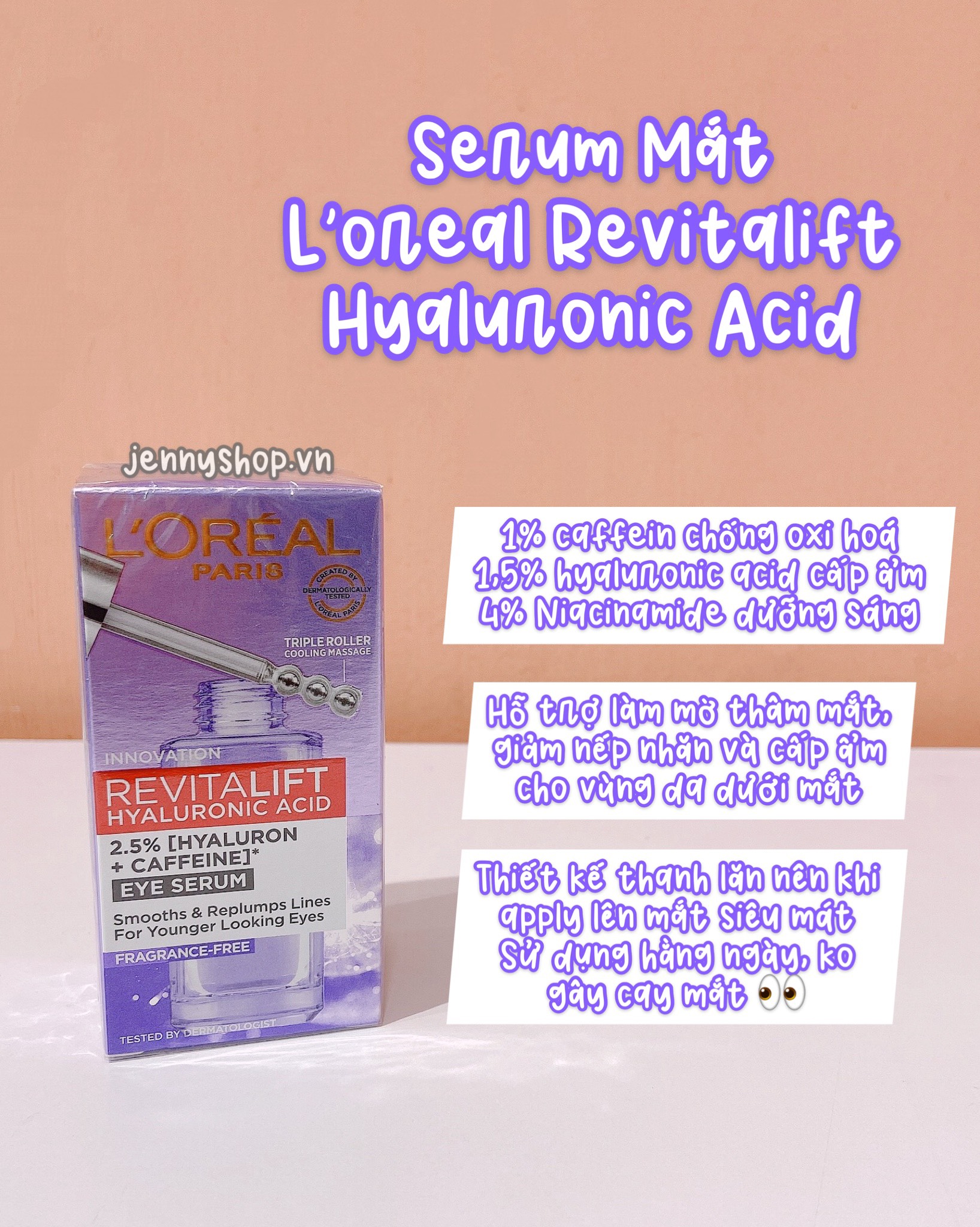 Tinh chất chứa thành phần Axit Hyaluronic siêu nhỏ giúp thâm nhập sâu hơn vào lớp biểu bì, huyết thanh giúp dưỡng ẩm mạnh mẽ, làm mịn và làm đầy lại các nếp nhăn ở mắt.