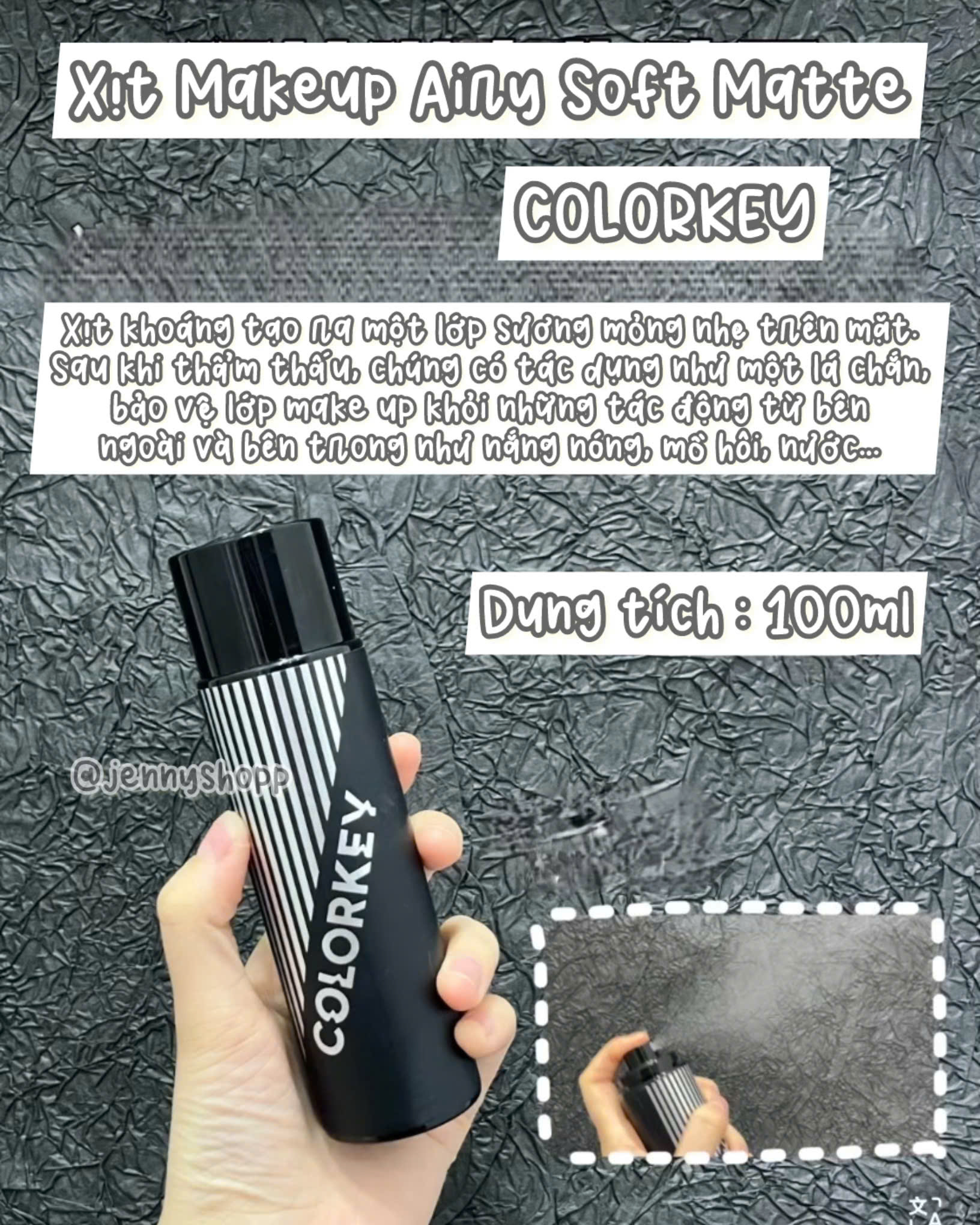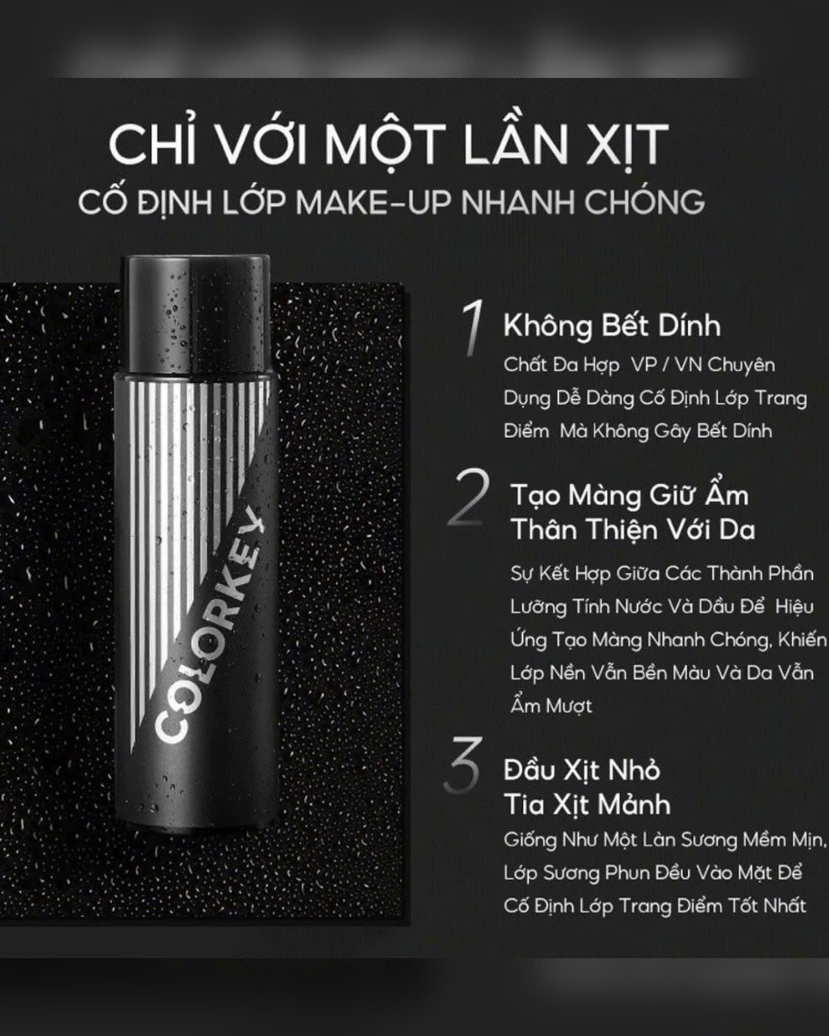 Bạn không cần lo lắng lớp makeup bị xuống tông hay trôi đi khi ngày dài trôi qua nữa! Với Xịt Khóa Nền Colorkey, lớp nền của bạn không chỉ được bảo vệ bền chặt mà còn mướt mịn, không lo mốc nền.